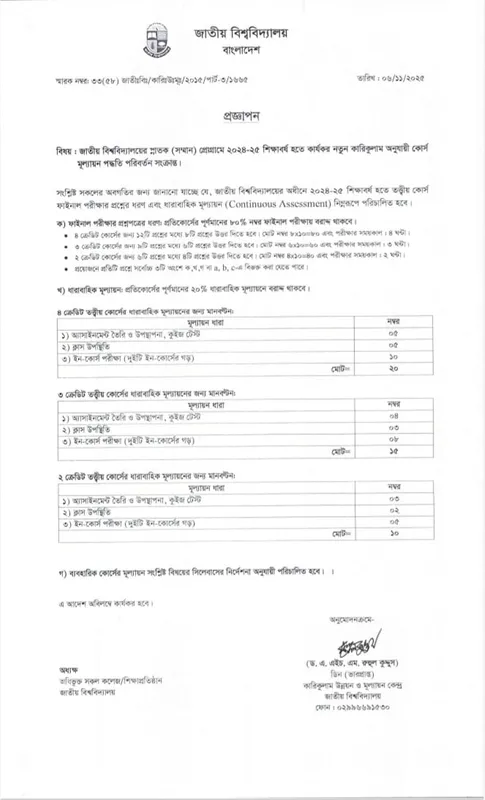 বৃহস্পতিবার (৬ নভেম্বর) জাতীয় বিশ্ববিদ্যালয়ের ভারপ্রাপ্ত ডিন (কারিকুলাম উন্নয়ন ও মূল্যায়ন কেন্দ্র) স্বাক্ষরিত প্রজ্ঞাপনে বলা হয়েছে, আগামী ২০২৪-২৫ শিক্ষাবর্ষ থেকে তত্ত্বীয় কোর্সগুলোর ফাইনাল পরীক্ষায় পূর্ণমানের ৮০% নম্বর বরাদ্দ থাকবে। বাকি ২০% নম্বর ধারাবাহিক মূল্যায়নের মাধ্যমে নির্ধারিত হবে।