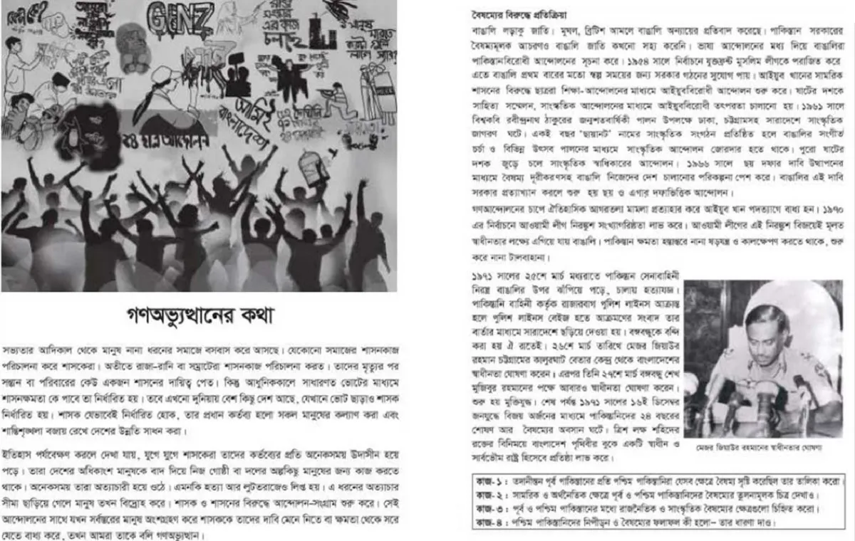 একই বইয়ে ‘স্বাধীন বাংলাদেশে গণঅভ্যুত্থান’ শিরোনামে নতুন একটি পাঠ যুক্ত করা হয়েছে। এতে ১৯৭৫ সালে একদলীয় শাসনব্যবস্থা প্রবর্তন, ১৯৭৯ সালে বহুদলীয় গণতন্ত্রে প্রত্যাবর্তন, ১৯৮২ সালে সামরিক শাসন এবং ১৯৯০ সালের গণঅভ্যুত্থানের ধারাবাহিক বিবরণ দেওয়া হয়েছে। এই ধারাবাহিকতার অংশ হিসেবে যুক্ত হয়েছে ২০২৪ সালের জুলাই গণঅভ্যুত্থানের ঘটনা। পাঠে শহীদ নূর হোসেনের ঐতিহাসিক ছবি এবং জুলাই আন্দোলনে নিহত আবু সাঈদের দুই হাত প্রসারিত করা ছবিও অন্তর্ভুক্ত করা হয়েছে।