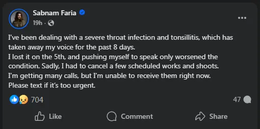 শবনম ফারিয়া আরও জানিয়েছেন, ৫ তারিখে কথা বলার শক্তি হারিয়ে ফেলেছিলাম। নিজেকে জোর করে কথা বলার চেষ্টা করায় অবস্থা আরও খারাপ হয়েছে। দুঃখের বিষয়, আমাকে কয়েকটি নির্ধারিত কাজ ও শুটিং বাতিল করতে হয়েছে।