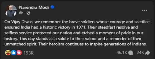 মোদির পোস্টে উল্লেখ করা হয়, বিজয় দিবসে আমরা সেই সাহসী সৈনিকদের স্মরণ করি, যাদের দৃঢ় সংকল্প ও আত্মত্যাগের কারণে ১৯৭১ সালে ভারত ঐতিহাসিক বিজয় অর্জন করেছিল। তাদের নিঃস্বার্থ সেবা আমাদের জাতিকে রক্ষা করেছে এবং ইতিহাসে গর্বের মুহূর্ত স্থাপন করেছে।