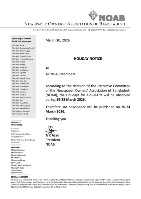 মঙ্গলবার এক বিজ্ঞপ্তিতে সংগঠনটি জানায়, নোয়াবের নির্বাহী কমিটির সিদ্ধান্ত অনুযায়ী চলতি বছর ঈদুল ফিতর উপলক্ষে ১৯ মার্চ থেকে ২৩ মার্চ পর্যন্ত সংবাদপত্র সংশ্লিষ্টদের জন্য ছুটি নির্ধারণ করা হয়েছে।