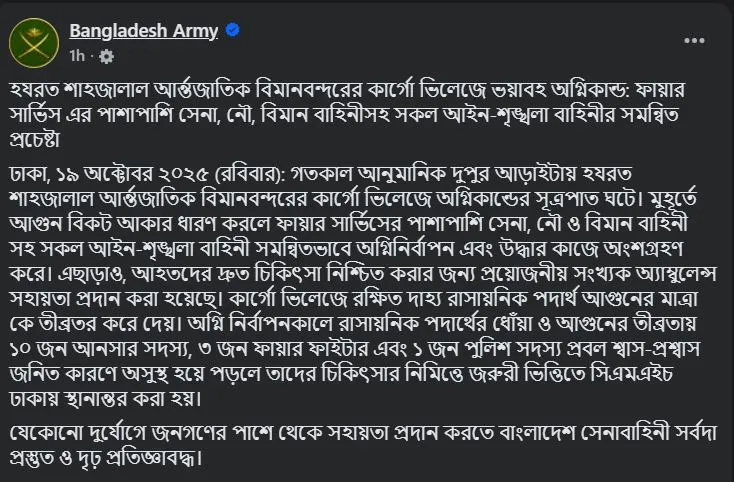 রবিবার (১৯ অক্টোবর) সকালে দেওয়া ওই পোস্টে বলা হয়, শনিবার (১৮ অক্টোবর) দুপুর আড়াইটার দিকে বিমানবন্দরের কার্গো ভিলেজে হঠাৎ আগুনের সূত্রপাত ঘটে। মুহূর্তের মধ্যেই আগুন ভয়াবহ আকার ধারণ করলে ফায়ার সার্ভিসের পাশাপাশি সেনাবাহিনী, নৌবাহিনী, বিমানবাহিনীসহ বিভিন্ন আইনশৃঙ্খলা রক্ষাকারী বাহিনী সমন্বিতভাবে অগ্নিনির্বাপন ও উদ্ধার কাজে অংশ নেয়।
