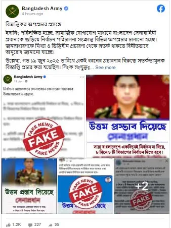ফেসবুক পোস্টে বলা হয়, বিভ্রান্তিকর অপপ্রচার প্রসঙ্গে ইদানিং পরিলক্ষিত হচ্ছে, সামাজিক যোগাযোগ মাধ্যমে বাংলাদেশ সেনাবাহিনী প্রধান’কে জড়িয়ে নির্বাচন পরিচালনা সংক্রান্ত বিভিন্ন অপপ্রচার চালানো হচ্ছে। জনসাধারণকে মিথ্যা ও ভিত্তিহীন প্রচারণা থেকে সতর্ক থাকতে বিনীতভাবে অনুরোধ জানানো যাচ্ছে।