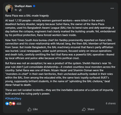 প্রধান উপদেষ্টার প্রেস সচিব শফিকুল আলম রানা প্লাজা ধসকে ‘আওয়ামী লীগের তৈরি ট্র্যাজেডি’ হিসেবে বর্ণনা করেছেন। তিনি বলেছেন, বিশ্বের ইতিহাসের অন্যতম ভয়াবহ শিল্প দুর্ঘটনায় অন্তত ১,১৩০ জন নিহত হয়েছেন, যাদের বেশিরভাগই নারী পোশাকশ্রমিক। ঘটনার মূল কারণ ছিল ভবনটির মালিক সোহেল রানা এবং তার আওয়ামী লীগের রাজনৈতিক প্রভাব ব্যবহার করে নিয়ম ও সতর্কবার্তা উপেক্ষা করা।