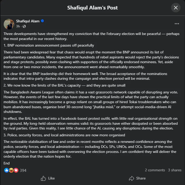 স্ট্যাটাসে তিনি জোর দিয়ে বলেন, সবকিছু মিলিয়ে দেশের রাজনৈতিক পরিস্থিতি এখন এমন জায়গায় দাঁড়িয়েছে যেখানে বড় কোনো অস্থিরতার সম্ভাবনা নেই এবং নির্বাচনী পরিবেশ আরও শক্তিশালী হয়েছে।