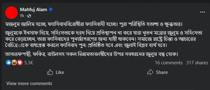 তথ্য উপদেষ্টা মাহফুজ আলম পোস্টে লিখেছেন, মজলুম জালিম হচ্ছে, ফ্যাসিবাদবিরোধীরা ফ্যাসিবাদী হয়ে উঠছে। পুরো পরিস্থিতি হতাশা ও ক্ষুব্ধতার। জুলুমকে ইনসাফ দিয়ে, সহিংসতাকে দরদ দিয়ে প্রতিস্থাপন না করে, যারা নতুন মাত্রার জুলুম ও সহিংসতা করছে, তারা ফ্যাসিবাদের পুনর্জাগরণের জন্য দায়ী থাকবেন। সমাজ ও রাষ্ট্রে চিন্তা ও আচারের বৈচিত্র্যকে বাধাগ্রস্ত করলে ফ্যাসিবাদ পুনঃপ্রতিষ্ঠিত হবে এবং জুলাই বিপ্লব ব্যর্থ হবে।