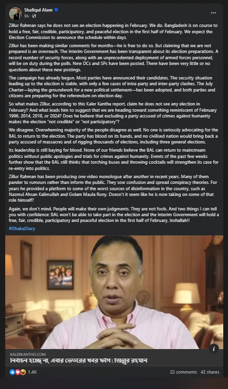 শফিকুল আলম সতর্ক করে বলেন, জনগণ সচেতন। বিভ্রান্তিমূলক তথ্য ছড়ানো হলে সেগুলো ধ্বংস হবে। অন্তর্বর্তী সরকার নির্বাচনের স্বচ্ছতা, নিরাপত্তা এবং অংশগ্রহণ নিশ্চিত করতে প্রতিশ্রুতিবদ্ধ।