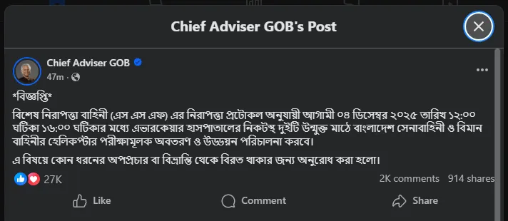 বিশেষ নিরাপত্তা বাহিনী (এসএসএফ)-এর নিরাপত্তা প্রটোকলের আওতায় আগামী বৃহস্পতিবার (৫ ডিসেম্বর) দুপুর ১২টা থেকে বিকাল ৪টার মধ্যে এভারকেয়ার হাসপাতালের নিকটস্থ দুটি উন্মুক্ত মাঠে বাংলাদেশ সেনাবাহিনী ও বিমান বাহিনীর হেলিকপ্টার পরীক্ষা মূলক অবতরণ এবং উড্ডয়ন পরিচালিত হবে।