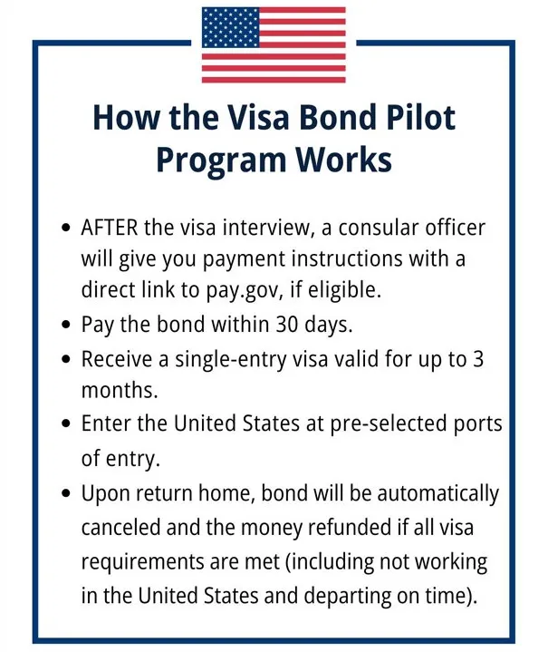 এই কর্মসূচির আওতায় ভ্রমণকারীদের সর্বোচ্চ ১৫ হাজার মার্কিন ডলার পর্যন্ত ‘ভিসা বন্ড’ বা নিরাপত্তা জামানত জমা দিতে হতে পারে। ভিসার সব শর্ত ঠিকভাবে পালন করে নির্ধারিত সময়ের মধ্যে দেশে ফিরলে এই অর্থ ফেরত দেওয়া হবে।