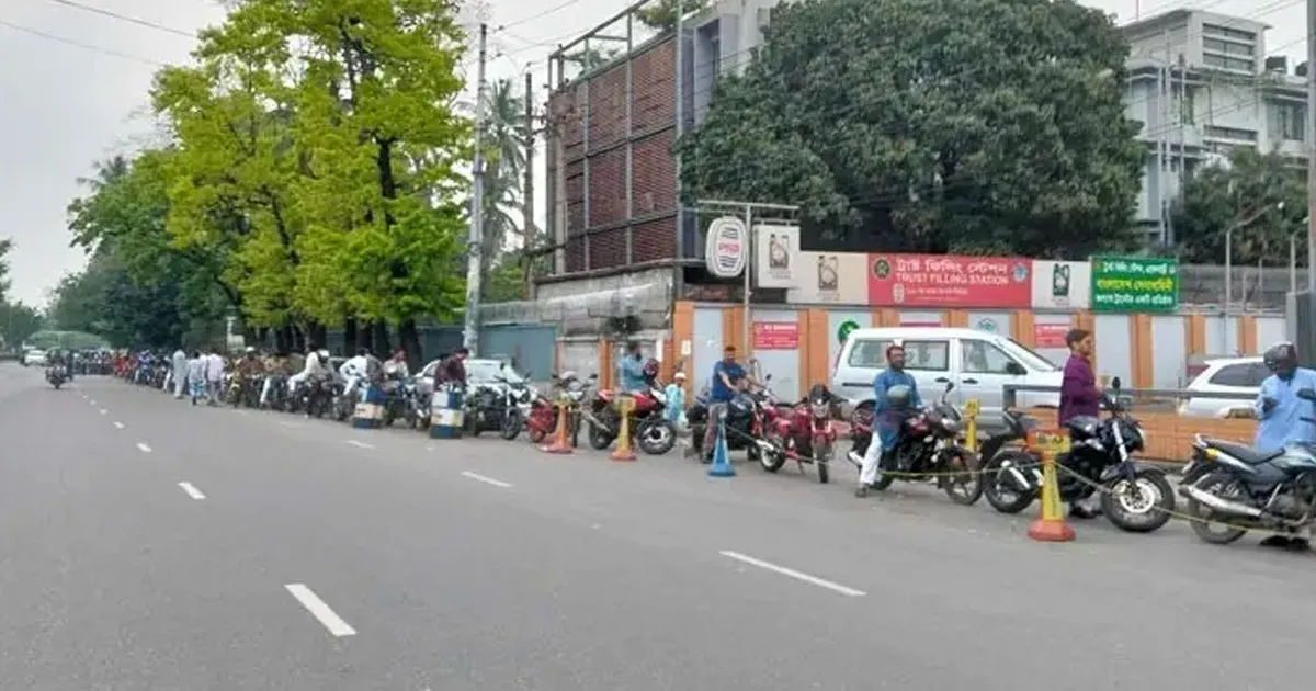 শনিবার (২১ মার্চ) দুপুরের দিকে রাজধানীর বিভিন্ন এলাকায় সরেজমিনে দেখা যায়, তেল পাম্পগুলোর সামনে গাড়ি ও মোটরসাইকেলের দীর্ঘ সারি। অনেককে এক থেকে দুই ঘণ্টা পর্যন্ত অপেক্ষা করতে হয়েছে।