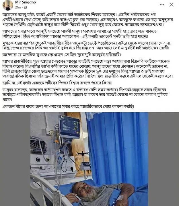 তিনি লেখেন, আমাদের আব্বু হঠাৎ করেই একটি মেজর হার্ট অ্যাটাকের শিকার হয়েছেন। এত বছরেও তাকে এত বড় অসুস্থতায় পড়তে দেখিনি। ছোটখাটো অসুখ হলে তিনি নিজেই ওষুধ খেয়ে সুস্থ হয়ে যেতেন, আমাদের জানাতেনও না। আমাদের সবচেয়ে সাহসী মানুষটি আজ হার্ট অ্যাটাকের রোগী।