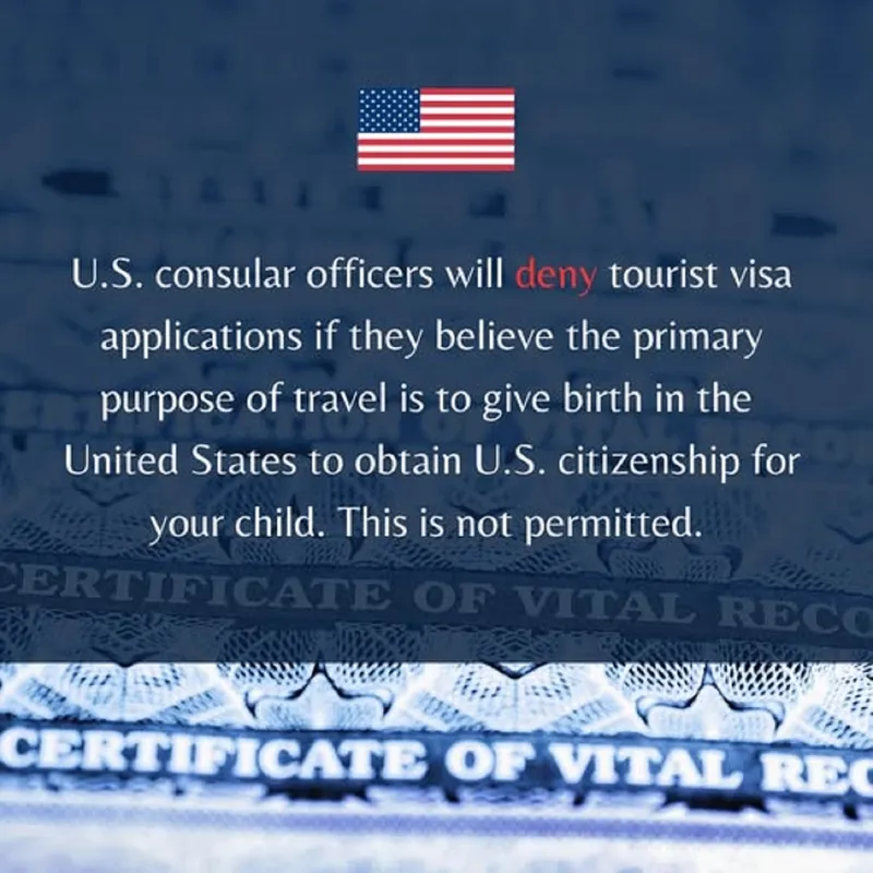 পোস্টে বলা হয়, কেউ যদি মূলত সন্তান জন্মের মাধ্যমে যুক্তরাষ্ট্রের নাগরিকত্ব অর্জনের উদ্দেশ্যে সেখানে ভ্রমণ করেন, তাহলে তা পর্যটক ভিসার (ট্যুরিস্ট ভিসা) শর্তের সঙ্গে অসঙ্গতিপূর্ণ। কনস্যুলার কর্মকর্তারা যদি সাক্ষাৎকার বা নথিপত্র যাচাইয়ের সময় এমন উদ্দেশ্যের ইঙ্গিত পান, তাহলে সংশ্লিষ্ট আবেদনকারীর ভিসা আবেদন সরাসরি প্রত্যাখ্যান করা হতে পারে।