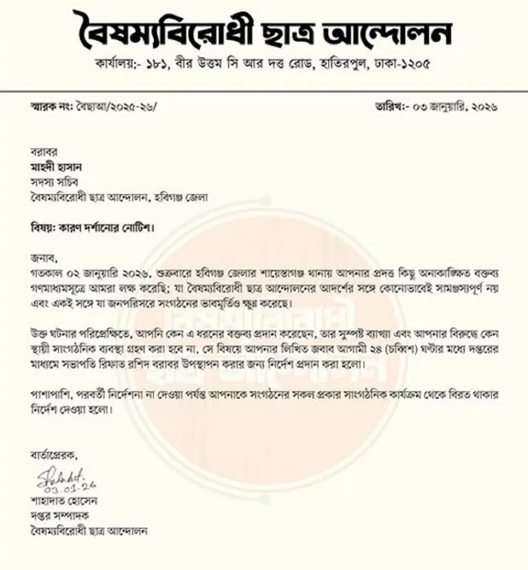 অপরদিকে শোকজ চিঠি অনুযায়ী, শুক্রবার (২ জানুয়ারি) শায়েস্তাগঞ্জ থানায় মাহদীর দেওয়া অনাকাঙ্ক্ষিত বক্তব্য সংগঠনের আদর্শের সঙ্গে সামঞ্জস্যপূর্ণ নয় এবং জনপরিসরে সংগঠনের ভাবমূর্তিও ক্ষুণ্ন করেছে। চিঠিতে তাকে আগামী ২৪ ঘণ্টার মধ্যে লিখিত ব্যাখ্যা প্রদান করতে বলা হয়েছে এবং পরবর্তী নির্দেশ না দেওয়া পর্যন্ত সমস্ত সাংগঠনিক কার্যক্রম থেকে বিরত থাকার নির্দেশ দেওয়া হয়েছে।