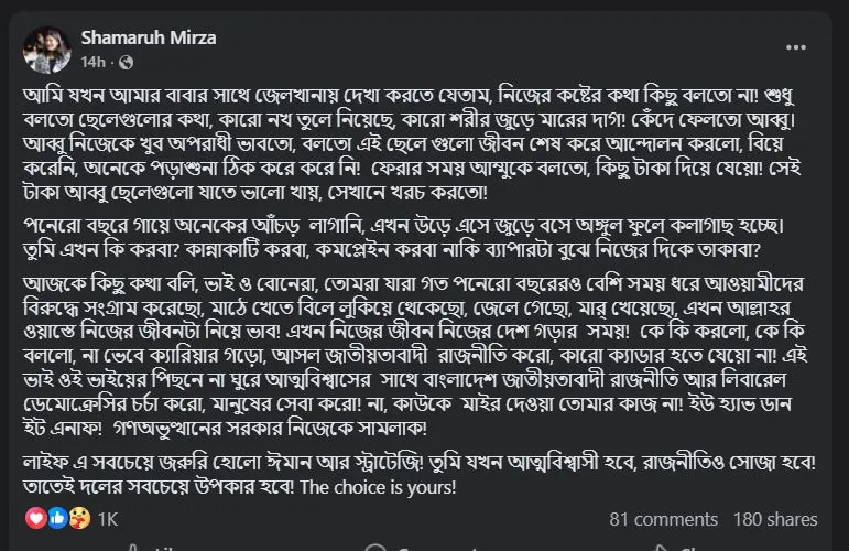 বিএনপি মহাসচিব মির্জা ফখরুল ইসলাম আলমগীরের মেয়ে শামারুহ মির্জা দলের ত্যাগী কর্মীদের প্রতি এক আবেগঘন বার্তা দিয়েছেন। বৃহস্পতিবার (২৫ সেপ্টেম্বর) রাতে নিজের ফেসবুক আইডিতে দেওয়া পোস্টে তিনি বাবার কারাজীবনের অভিজ্ঞতা তুলে ধরেন এবং দলীয় নেতাকর্মীদের উদ্দেশ্যে অতীতের সংঘাতপূর্ণ রাজনীতি থেকে সরে এসে ব্যক্তিগত জীবন গড়া এবং উদার গণতান্ত্রিক (লিবারেল ডেমোক্রেসির) রাজনীতি চর্চার আহ্বান জানিয়েছেন।