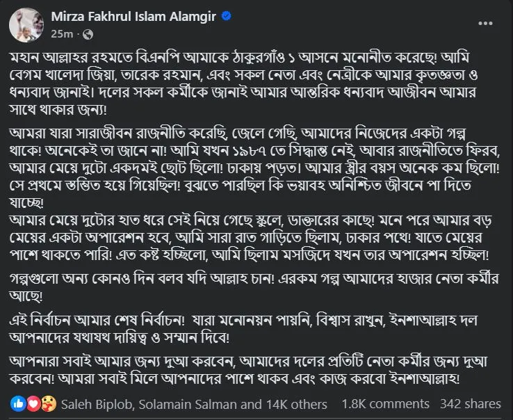 আসন্ন ত্রয়োদশ জাতীয় সংসদ নির্বাচনে ঠাকুরগাঁও-১ আসন থেকে বিএনপির মনোনয়ন পাওয়ার পর আবেগঘন একটি স্ট্যাটাস দিয়েছেন দলীয় মহাসচিব মির্জা ফখরুল ইসলাম আলমগীর।