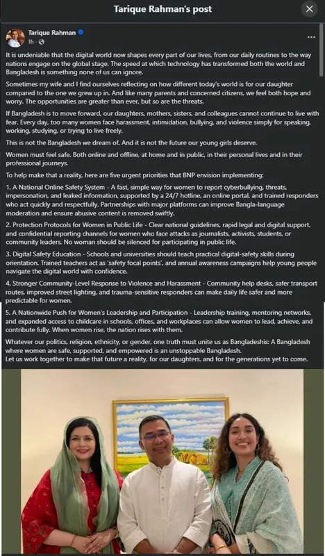 তারেক রহমান জন্মদিনের বার্তায় দেশের নারীদের নিরাপত্তা, প্রযুক্তিনির্ভর সমাজ এবং ডিজিটাল যুগের ঝুঁকি–সবকিছু নিয়েই গভীর উদ্বেগ প্রকাশ করেন।