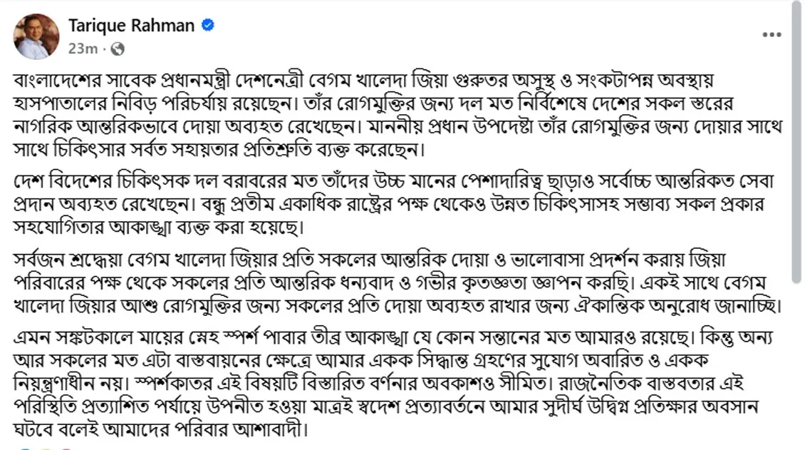 স্ট্যাটাসে তিনি জানান, খালেদা জিয়া এখন এভারকেয়ার হাসপাতালের সিসিইউয়ে গুরুতর অসুস্থ অবস্থায় নিবিড় চিকিৎসাধীন আছেন। দল-মত-নির্বিশেষে সাধারণ মানুষ, সমর্থক, শুভাকাঙ্ক্ষীসহ দেশের সর্বস্তরের নাগরিক তার সুস্থতার জন্য প্রার্থনা করছেন—এজন্য তিনি পরিবারের পক্ষ থেকে বিশেষ কৃতজ্ঞতা জানান।