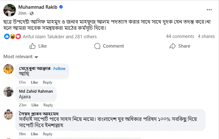তিনি লিখেছেন, ছাত্র উপদেষ্টা আসিফ মাহমুদ ও মাহফুজ আলম পদত্যাগের সঙ্গে সঙ্গে দুদক যেন তাদের বিষয়ে তদন্ত শুরু করে। না হলে আমরা সাবেক সমন্বয়করা মাঠে কর্মসূচি দেব।