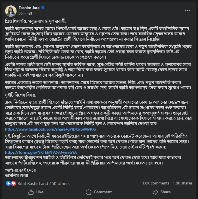 শনিবার (২৭ ডিসেম্বর) সামাজিক যোগাযোগ মাধ্যমে নিজের ভেরিফায়েড ফেসবুক পেজে দেওয়া এক স্ট্যাটাসে তাসনিম জারা জানিয়েছেন, খিলগাঁও, সবুজবাগ ও মুগদাবাসী এলাকার মানুষ হিসেবে তিনি রাজনৈতিক দল বা জোটের ছত্রছায়ায় না থেকে নিজের উদ্যোগে নির্বাচনে অংশ নেবেন।