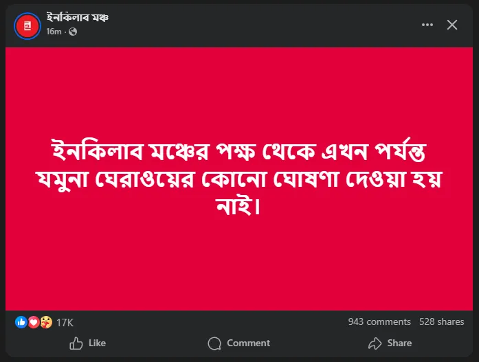 পোস্টে বলা হয়, ইনকিলাব মঞ্চের পক্ষ থেকে এখন পর্যন্ত যমুনা ঘেরাওয়ের কোনো ঘোষণা দেওয়া হয় নাই।