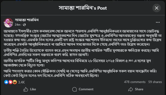 রবিবার (২৮ ডিসেম্বর) বিকেল ৫টায় রাজধানীর জাতীয় প্রেস ক্লাবে আয়োজিত সংবাদ সম্মেলনে জামায়াতে ইসলামীর আমির ডা. শফিকুর রহমান আনুষ্ঠানিকভাবে এনসিপিকে জোটভুক্ত করার ঘোষণা দেন। ঘোষণার প্রায় ৪৩ মিনিট পর, বিকেল ৫টা ৪৩ মিনিটে সামাজিক যোগাযোগমাধ্যম ফেসবুকে এক পোস্ট দিয়ে প্রতিক্রিয়া জানান সামান্তা শারমিন।