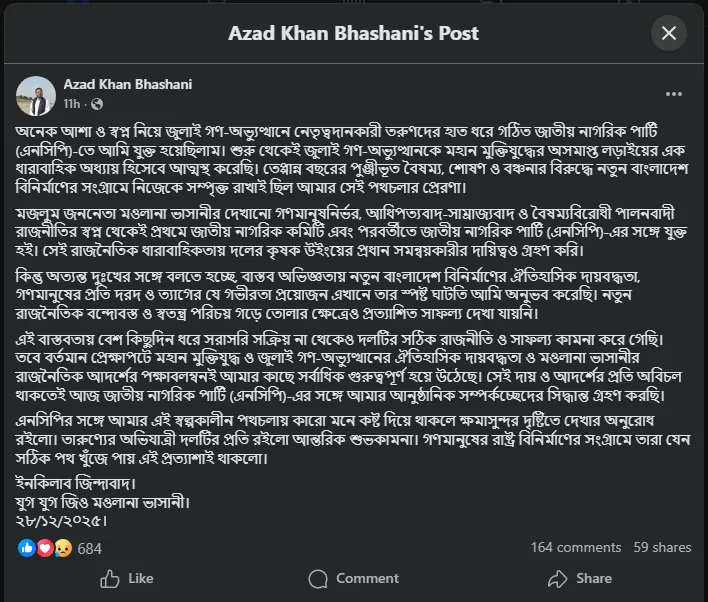পোস্টে আজাদ খান ভাসানী উল্লেখ করেন, জুলাই গণঅভ্যুত্থানে নেতৃত্বদানকারী তরুণদের হাত ধরে গঠিত জাতীয় নাগরিক পার্টির সঙ্গে তিনি যুক্ত হয়েছিলেন অনেক আশা ও স্বপ্ন নিয়ে। তার দৃষ্টিতে, জুলাই গণঅভ্যুত্থান ছিল মহান মুক্তিযুদ্ধের অসমাপ্ত সংগ্রামেরই একটি ধারাবাহিক পর্ব। দীর্ঘ ৫৩ বছরের বৈষম্য, শোষণ ও বঞ্চনার বিরুদ্ধে নতুন বাংলাদেশ গড়ে তোলার আন্দোলনে নিজেকে সম্পৃক্ত রাখাই ছিল তার রাজনৈতিক যাত্রার মূল প্রেরণা।