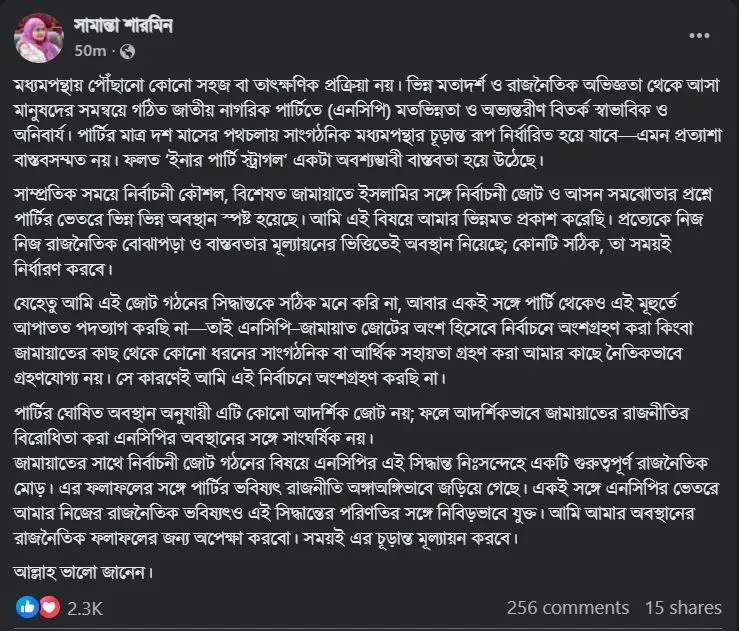সামান্তা শারমিন বলেন, পার্টি থেকে আপাতত পদত্যাগ করছি না, তবে এনসিপি–জামায়াত জোটের অংশ হিসেবে নির্বাচনে অংশগ্রহণ বা জামায়াতের কাছ থেকে কোনো ধরনের সাংগঠনিক বা আর্থিক সহায়তা গ্রহণ আমার কাছে নৈতিকভাবে গ্রহণযোগ্য নয়।