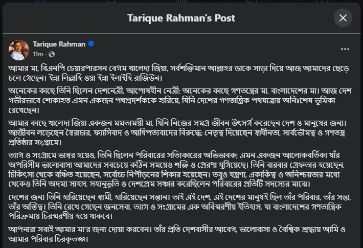 বিএনপি চেয়ারপারসন ও সাবেক প্রধানমন্ত্রী বেগম খালেদা জিয়ার মৃত্যুর পর তার পুত্র, বিএনপির ভারপ্রাপ্ত চেয়ারম্যান তারেক রহমান সামাজিক যোগাযোগ মাধ্যম ফেসবুকে বুধবার (৩০ ডিসেম্বর) দুপুর ২টায় একটি মর্মস্পর্শী বার্তা দেন।