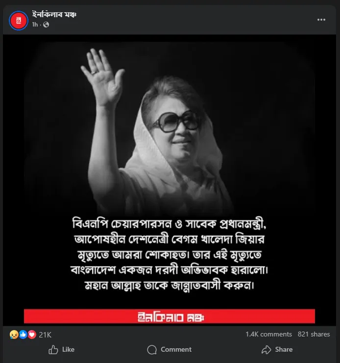 মঙ্গলবার (৩০ ডিসেম্বর) দুপুর ১টায় ফেসবুকে দেওয়া এক পোস্টে ইনকিলাব মঞ্চ উল্লেখ করেছে, বিএনপি চেয়ারপারসন ও সাবেক প্রধানমন্ত্রী, আপসহীন দেশনেত্রী বেগম খালেদা জিয়ার মৃত্যুতে আমরা শোকাহত। তার এই মৃত্যুতে বাংলাদেশ একজন দরদি অভিভাবক হারাল। মহান আল্লাহ তাকে জান্নাতবাসী করুন।
