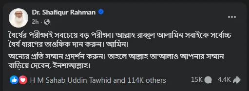 শুক্রবার (১৬ জানুয়ারি) রাতে নিজের ফেসবুক পেজে দেওয়া পোস্টে জামায়াত আমির লেখেন, ধৈর্যের পরীক্ষাই সবচেয়ে বড় পরীক্ষা। আল্লাহ রাব্বুল আলামিন সবাইকে সর্বোচ্চ ধৈর্য ধারণের তাওফিক দান করুন। আমিন। অন্যের প্রতি সম্মান প্রদর্শন করুন। তাহলে আল্লাহ তা’আলাও আপনার সম্মান বাড়িয়ে দেবেন, ইনশাআল্লাহ।