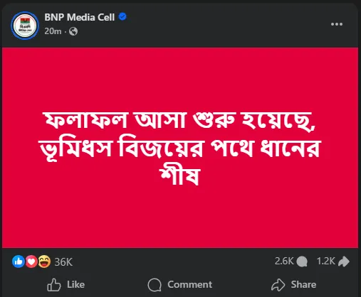এরই মধ্যে নির্বাচনে বড় ধরনের জয় পেতে যাচ্ছে বলে দৃঢ় আশাবাদ ব্যক্ত করেছে বিএনপি। বৃহস্পতিবার সন্ধ্যা ৭টার পর দলটির মিডিয়া সেলের ফেসবুক পেজে দেওয়া এক পোস্টে জানানো হয়, ফল প্রকাশ শুরু হয়েছে এবং ধানের শীষ প্রতীক বিপুল ব্যবধানে বিজয়ের পথে রয়েছে।