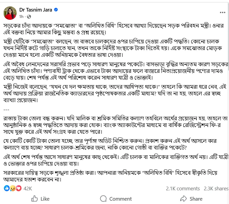 বৃহস্পতিবার (১৯ ফেব্রুয়ারি) ভেরিফায়েড ফেসবুক স্ট্যাটাসে ডা. জারা বলেন, যাকে মন্ত্রী সমঝোতা বলছেন, তা বাস্তবে চালকদের ওপর চাপিয়ে দেওয়া একটি অবৈধ প্রক্রিয়া। নির্দিষ্ট রুটে গাড়ি চালাতে গেলে চালকদের বাধ্যতামূলকভাবে নির্দিষ্ট সংস্থা বা গোষ্ঠীকে টাকা দিতে হয়। একে সমঝোতার মোড়ক দেওয়া মানে একটি অনিয়মকে বৈধতার ভাষা দেওয়া।