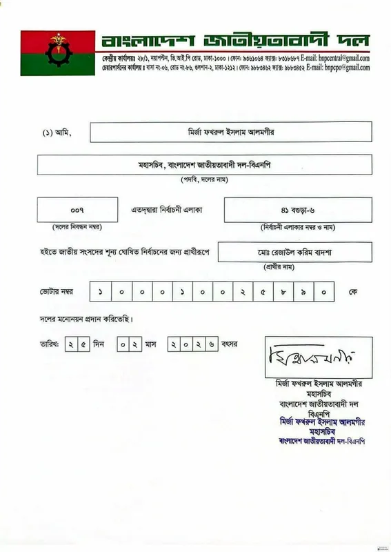 বগুড়া-৬ আসনের উপনির্বাচনে দলীয় প্রার্থী চূড়ান্ত করেছে বাংলাদেশ জাতীয়তাবাদী দল (বিএনপি)। দলের মহাসচিব মির্জা ফখরুল ইসলাম আলমগীর আনুষ্ঠানিকভাবে এ আসনে রেজাউল করিম বাদশাকে মনোনয়ন প্রদান করেন। তিনি বগুড়া জেলা বিএনপির সভাপতি হিসেবে দায়িত্ব পালন করছেন।