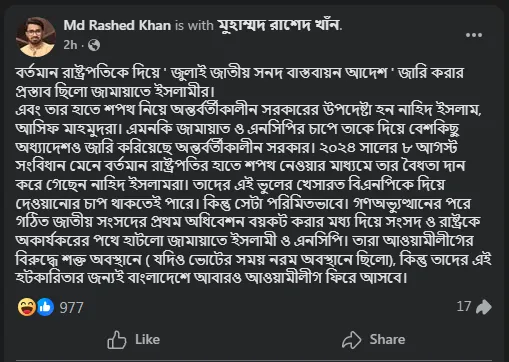 তিনি উল্লেখ করেছেন, বর্তমান রাষ্ট্রপতিকে দিয়ে ‘জুলাই জাতীয় সনদ বাস্তবায়ন আদেশ’ জারি করার প্রস্তাব ছিল জামায়াতে ইসলামীর এবং তার হাতে শপথ নিয়ে অন্তর্বর্তী সরকারের উপদেষ্টা হন নাহিদ ইসলাম, আসিফ মাহমুদরা।