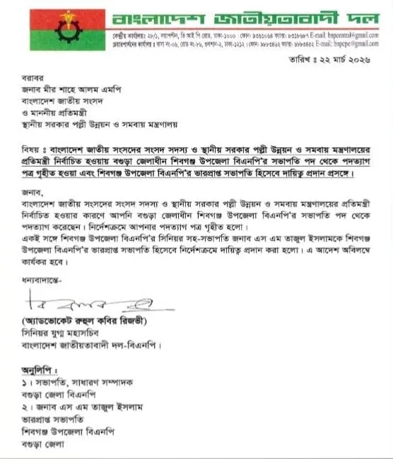 ওই বিজ্ঞপ্তিতে উল্লেখ করা হয়, সংসদ সদস্য হিসেবে নির্বাচিত হওয়া এবং স্থানীয় সরকার, পল্লী উন্নয়ন ও সমবায় মন্ত্রণালয়ের প্রতিমন্ত্রী হিসেবে দায়িত্ব গ্রহণের কারণে তিনি শিবগঞ্জ উপজেলা বিএনপির সভাপতি পদ থেকে পদত্যাগ করতে চান। সেই প্রেক্ষিতে তার পদত্যাগপত্র গ্রহণ করা হয়েছে।