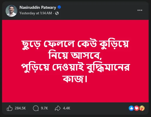 বুধবার (১ এপ্রিল) নিজের ভেরিফায়েড ফেসবুক আইডিতে তিনি লেখেন, “ছুড়ে ফেললে কেউ কুড়িয়ে নিয়ে আসবে, পুড়িয়ে দেওয়াই বুদ্ধিমানের কাজ।”