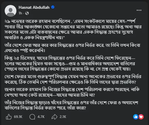 হাসনাত আব্দুল্লাহ ফেসবুক পোস্টে উল্লেখ করেন, ২৯ নভেম্বর প্রধানমন্ত্রী বলেছিলেন, সংকটকালে যে কোনো সন্তানের মতো তারও মায়ের স্নেহ–স্পর্শের আকাঙ্ক্ষা রয়েছে। তবে সে সময় দেশ ফেরা বা অন্য গুরুত্বপূর্ণ সিদ্ধান্ত গ্রহণের ক্ষেত্রে তার একক নিয়ন্ত্রণ নেই এবং সিদ্ধান্ত নেওয়া অন্যদের সঙ্গে সমন্বয়ের ওপর নির্ভরশীল। তিনি স্পষ্ট করেননি কারা তার দেশে ফেরা বা গুরুত্বপূর্ণ সিদ্ধান্তে প্রভাব ফেলে।