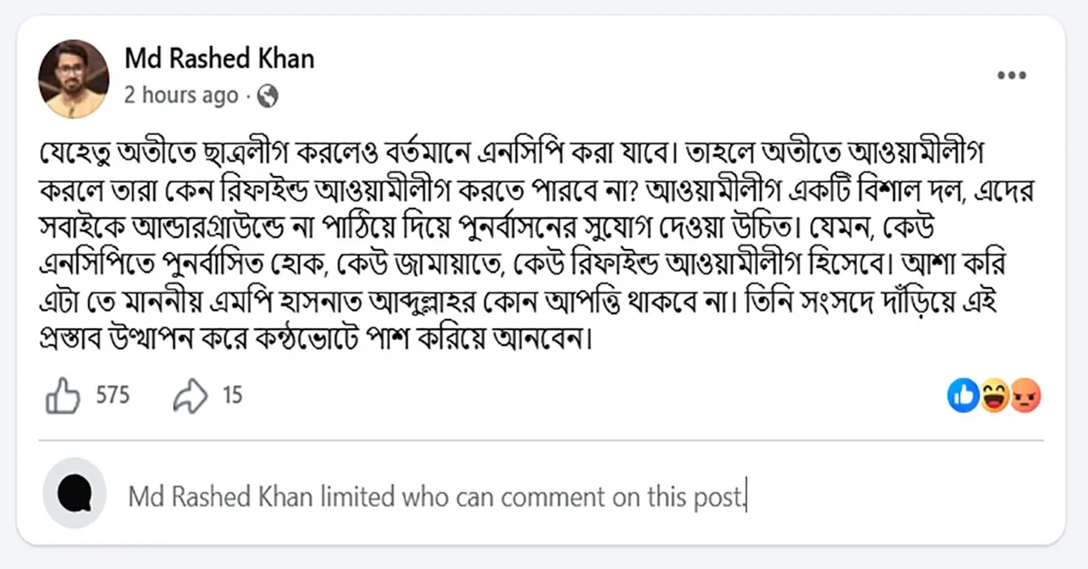 নিজের পোস্টে রাশেদ খান উল্লেখ করেন, যেহেতু অতীতে ছাত্রলীগ করা ব্যক্তিরা বর্তমানে এনসিপি (জাতীয় নাগরিক পার্টি) করতে পারছেন, তবে অতীতে আওয়ামী লীগ করা ব্যক্তিরা কেন ‘রিফাইন্ড আওয়ামী লীগ’ হিসেবে রাজনীতি করতে পারবেন না?