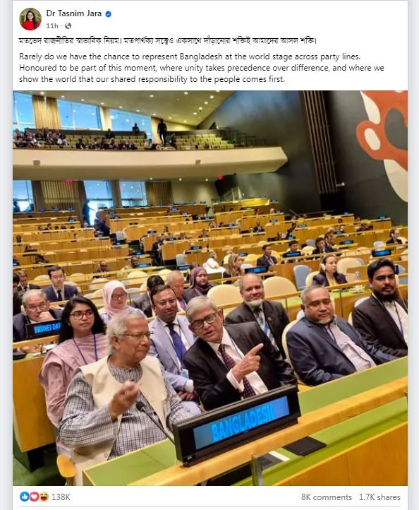 তিনি আরও উল্লেখ করেন, বিশ্বমঞ্চে বাংলাদেশের প্রতিনিধিত্ব করার সুযোগ খুব কমই আসে। এ ধরনের মুহূর্তে দল-মত নির্বিশেষে ঐক্যবদ্ধভাবে উপস্থিত হওয়া গর্বের বিষয়। এখানে ভিন্নতার চেয়ে ঐক্যকে প্রাধান্য দেওয়া হচ্ছে, আর আমরা বিশ্বকে দেখাচ্ছি জনগণের প্রতি যৌথ দায়িত্বই সর্বাগ্রে।