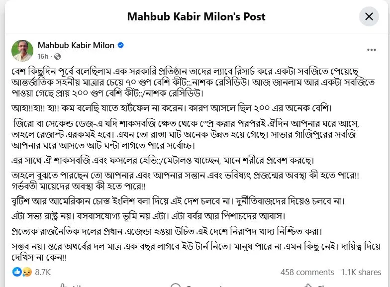 বাংলাদেশে সবজি উৎপাদনে গত এক দশকে বৈপ্লবিক অগ্রগতি হলেও নিরাপদ খাদ্যের দিক থেকে পরিস্থিতি উদ্বেগজনক। এক গবেষণার তথ্য তুলে ধরে অবসরপ্রাপ্ত অতিরিক্ত সচিব মো. মাহবুব কবীর মিলন জানিয়েছেন, দেশের কিছু সবজিতে আন্তর্জাতিক মানের সহনীয় সীমার চেয়ে প্রায় ২০০ গুণ বেশি কীটনাশক অবশিষ্টাংশ (রেসিডিউ) পাওয়া গেছে।