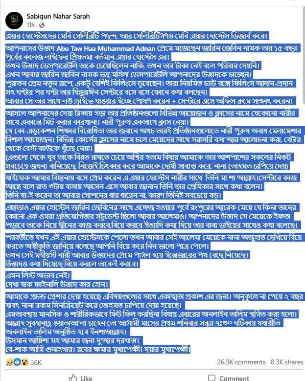 জনবাণীর পাঠকদের জন্য আবু ত্বহা মুহাম্মদ আদনানে স্ত্রীর পোস্টটি তুলে হুবহু ধরা হলো— এয়ার হোস্টেসদের মেবি সেলিব্রিটি পছন্দ, আর সেলিব্রিটিগণও মেবি এয়ার হোস্টেস ডিজার্ব করে। আপনাদের উস্তাদ Abu Taw Haa Muhammad Adnan প্রেমে মজেছেন জারিন জেবিন নামক তার ১৫ বছর পূর্বের কলেজ লাইফের প্রিয়তমা বর্তমান এয়ার হোস্টেস এর। তখন উস্তাদ ডেসপারেটলি তাকে চেয়েছিলেন নাকি, তখন তার টাকা নেই বলে পরিবার দেয়নি। এখন আবার জারিন জাবিন নামক ভদ্র মহিলা ডেসপারেটলি আপনাদের উস্তাদকে চাচ্ছেন।