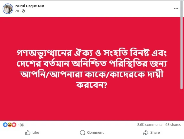 সামাজিক যোগাযোগমাধ্যমে নুরুল হক নুরের এই পোস্ট ঘিরে চলছে নানা বিশ্লেষণ ও বিতর্ক। অনেকেই মনে করছেন, এটি দেশের চলমান রাজনৈতিক পরিস্থিতি ও গণআন্দোলনের অভ্যন্তরীণ টানাপোড়েনের প্রতি তার ইঙ্গিত।