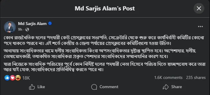 সারজিস আলম লিখেছেন, কোন রাজনৈতিক দলের পদধারী কেউ প্রেসক্লাবের সভাপতি, সেক্রেটারি থেকে শুরু করে কার্যনির্বাহী কমিটির কোনো পদে থাকতে পারবে না। এই শর্তে কেন্দ্রীয় ও জেলা পর্যায়ের প্রেসক্লাবের কমিটিগুলো হওয়া উচিত।