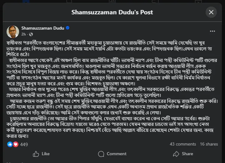 ফেসবুক পোস্টে তিনি আরও বলেন, চুয়াডাঙ্গার রাজনীতি তার রাজনৈতিক জীবনের ভিত্তি ও গর্ব।