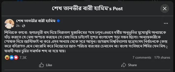 পোস্টে শেখ তানভীর বারী হামিম লেখেন, ধর্মীয় অনুভূতির মুখোমুখি অন্যায়কে দাঁড় করাতে যে মেধা অপচয় করছেন সে মেধা দিয়ে চাইলেই সুন্দর বাংলাদেশ গড়া সম্ভব ছিলো। অন্যায়কারীকে পোষাক দিয়ে জাস্টিফাই না করে এসব অন্যায় থেকে সরে আসুন।