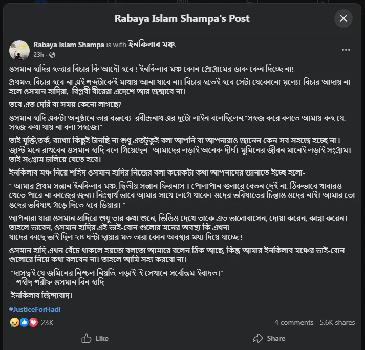 রাবেয়া ইসলাম লিখেছেন, ওসমান হাদির হত্যার বিচার কি আদৌ হবে? পাশাপাশি তিনি প্রশ্ন তুলেছেন, ইনকিলাব মঞ্চ কেন কোনো প্রোগ্রামের ডাক দিচ্ছে না।