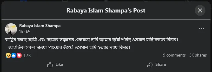 পোস্টে রাবেয়া ইসলাম শম্পা উল্লেখ করেন, রাষ্ট্রের কাছে আমি এবং আমার সন্তানের একমাত্র দাবি আমার স্বামী শহীদ ওসমান হাদি হত্যার বিচার। জাগতিক সকল চাওয়া-পাওয়ার ঊর্ধ্বে ওসমান হাদি হত্যার ন্যায় বিচার।
