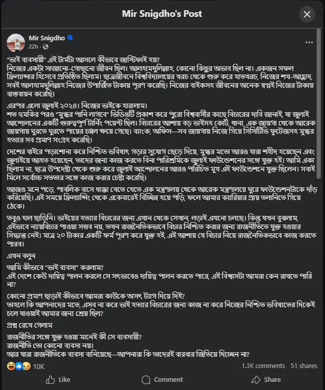পোস্টে স্নিগ্ধ লিখেছেন, ভাই হত্যার পর দীর্ঘদিন ধরে বিচার পাওয়ার আশায় বিভিন্ন জায়গায় দৌড়ঝাঁপ করেছেন। কিন্তু প্রচলিত প্রক্রিয়ায় ন্যায়বিচার পাওয়া সম্ভব হচ্ছে না— এমন উপলব্ধি থেকেই রাজনৈতিকভাবে সক্রিয় হওয়ার সিদ্ধান্ত নেন তিনি।
