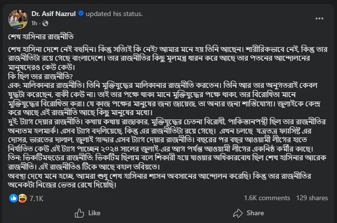 ফেসবুক পোস্টে ড. আসিফ নজরুল লিখেছেন, শেখ হাসিনা শারীরিকভাবে দেশে উপস্থিত না থাকলেও তার রাজনৈতিক চিন্তাধারা পুরোপুরি বিলীন হয়নি। বরং তার রাজনীতির কিছু মূল ধারণা এখনও সমাজ ও রাজনীতির বিভিন্ন স্তরে রয়ে গেছে। এমনকি তার পতনের আন্দোলনে অংশ নেওয়া কিছু মানুষের মধ্যেও সেই ধারা আংশিকভাবে বিদ্যমান বলে তিনি মন্তব্য করেন।