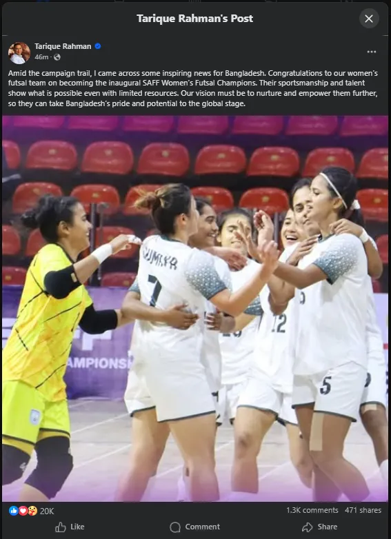 সাফ ফুটসালে ইতিহাস গড়া নারী দলকে অভিনন্দন জানাল তারেক রহমান